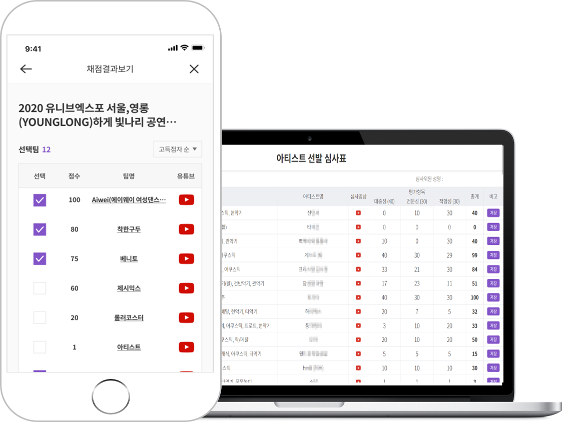 이메일 참가신청, 공연팀 신청 관리, 공연영상 확인, 심사 및 채점 등 번거로운 공연팀 모집 업무.