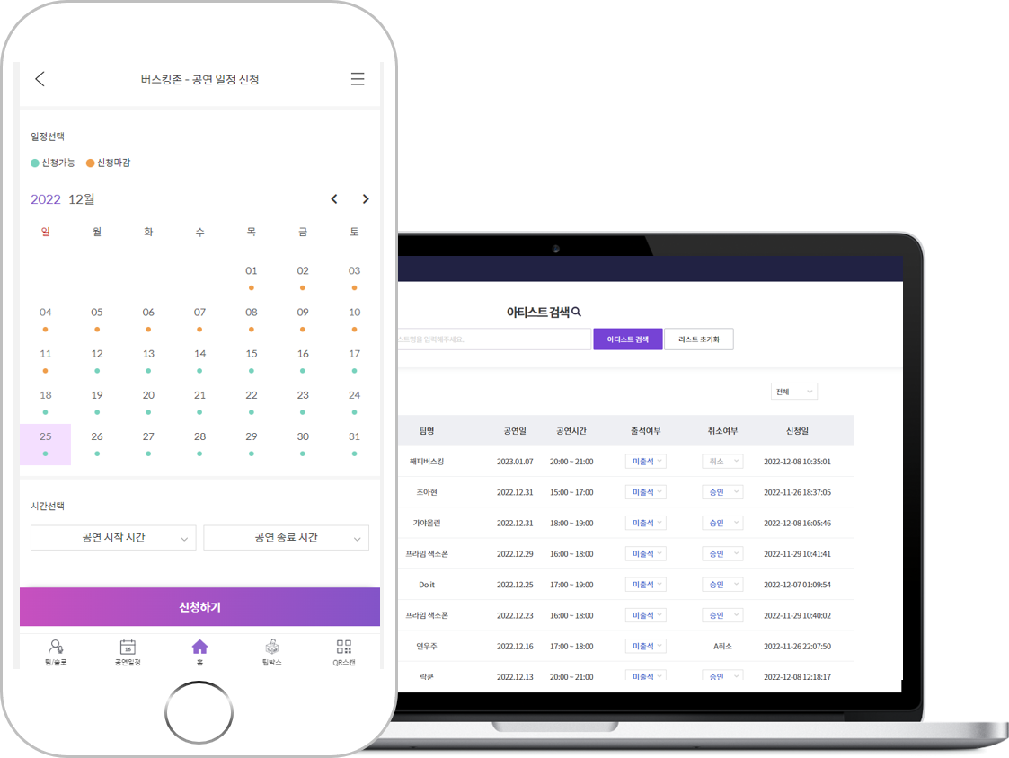 기관(단체)은 PC 관리자 페이지를 통해 공연팀 신청 내역 승인 관리로 쉽고 간편한 공연 운영 및 일정관리가 가능합니다.