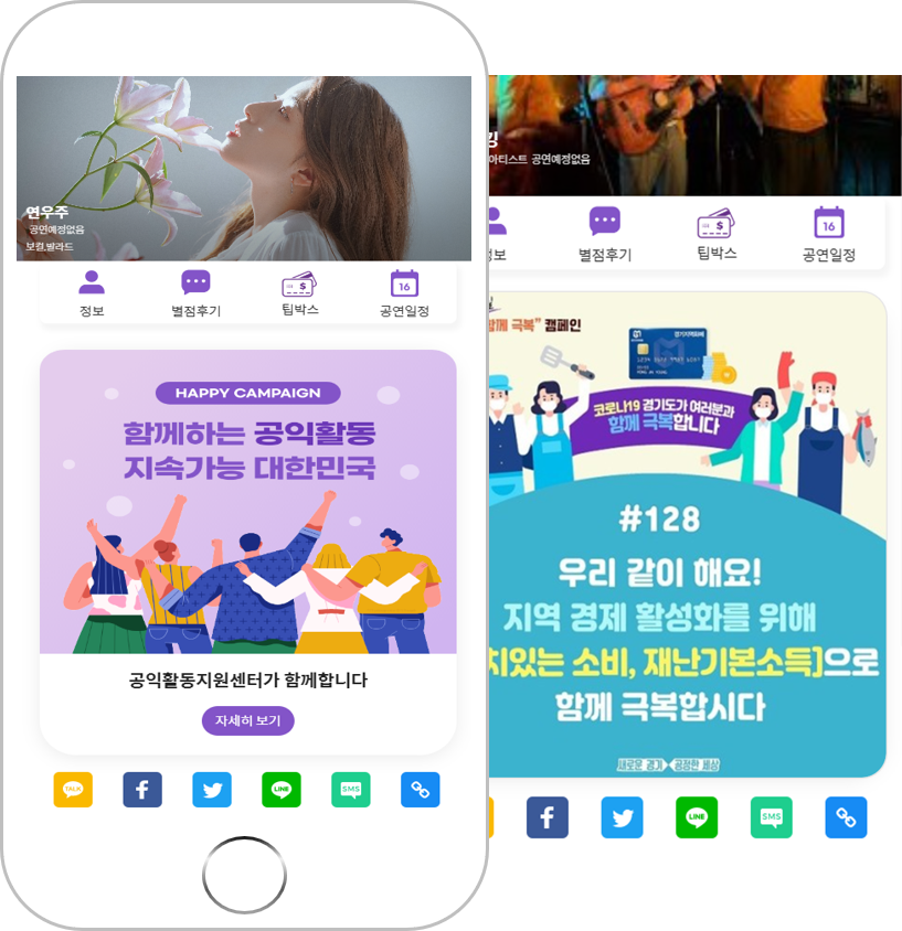 공연, 작품활동을 하는 장소에 있는 QR코드 스캔만으로 아티스트 정보와 함께 캠페인 콘텐츠를 노출 시키고 SNS API 연동을 이용한 간편한 콘텐츠 공유로 빠른 홍보 확산을 제공합니다.