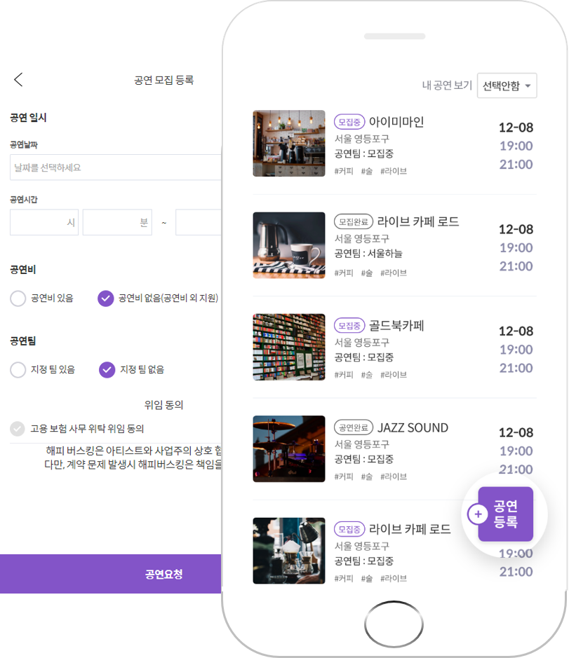 이제 해피버스킹 플랫폼에 등록된 아티스트를 쉽고 간편하게 모집해 보세요.