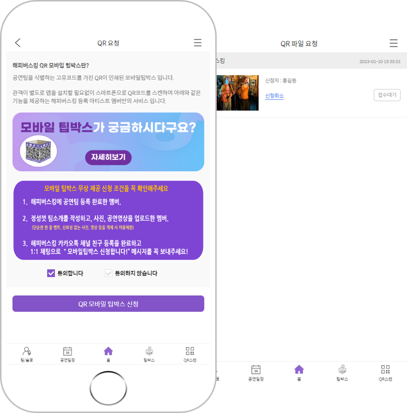 공연장에 비치하여 아티스트를 알릴 수 있는 QR코드가 인쇄된 모바일 팁박스 신청 메뉴 입니다.