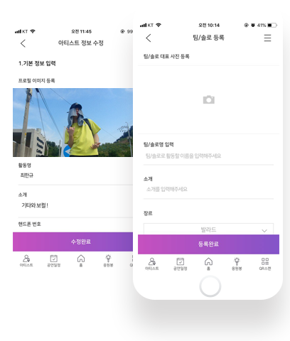 팀 및 솔로 등록은 회원가입과 아티스트 등록을 완료 한 후 이용이 가능하며, 앱에 노출되기 위해서는 반드시 등록해야 합니다.