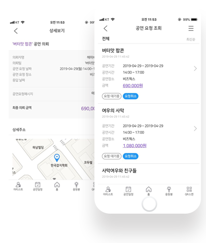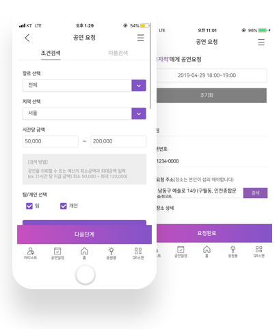 다수의 아티스트에게 동시에 공연 요청이 가능하며, 요청을 받은 아티스트가 공연 가능여부를 앱을 통하여 확정하면 요청자가 최종적으로 아티스트를 선택하여 공연이 이루어 지게 됩니다.