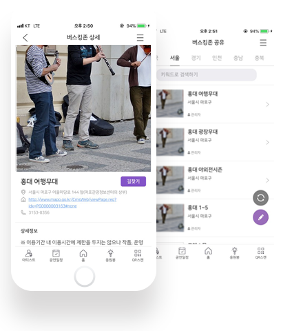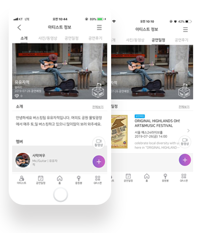아티스트 정보는 QR코드 스캔 또는 메뉴 트리를 이용하여 확인할 수 있으며 앱에서 팀명, 지역별, 장르별로 편리하게 검색할 수 있습니다.