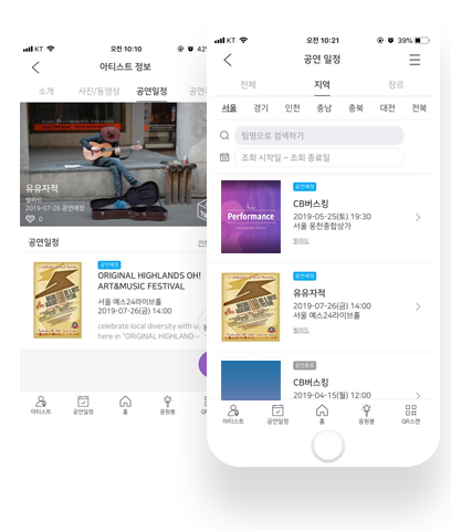 아티스트 공연일정을 확인하는 메뉴로 날짜별, 지역별, 장르별로 관심있는 공연을 검색할 수 있습니다.